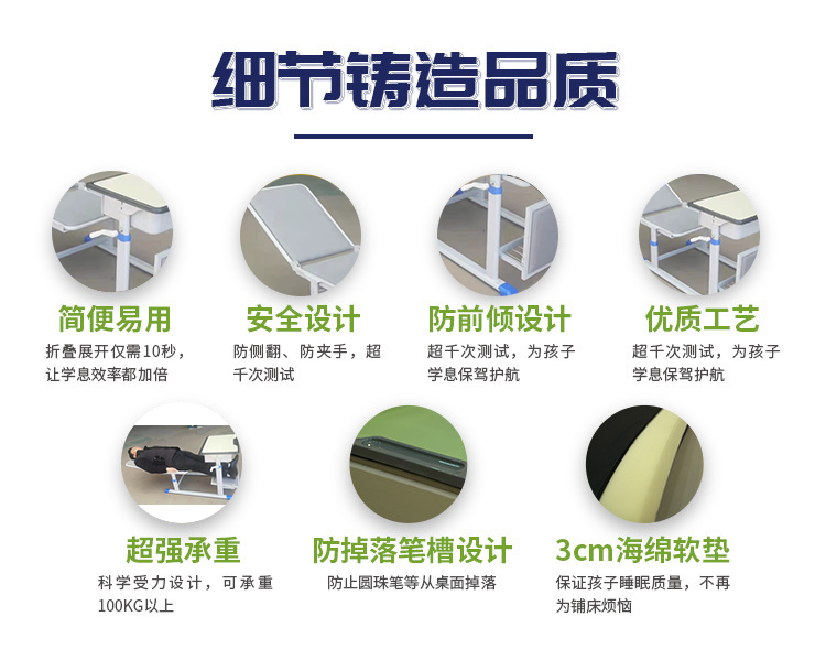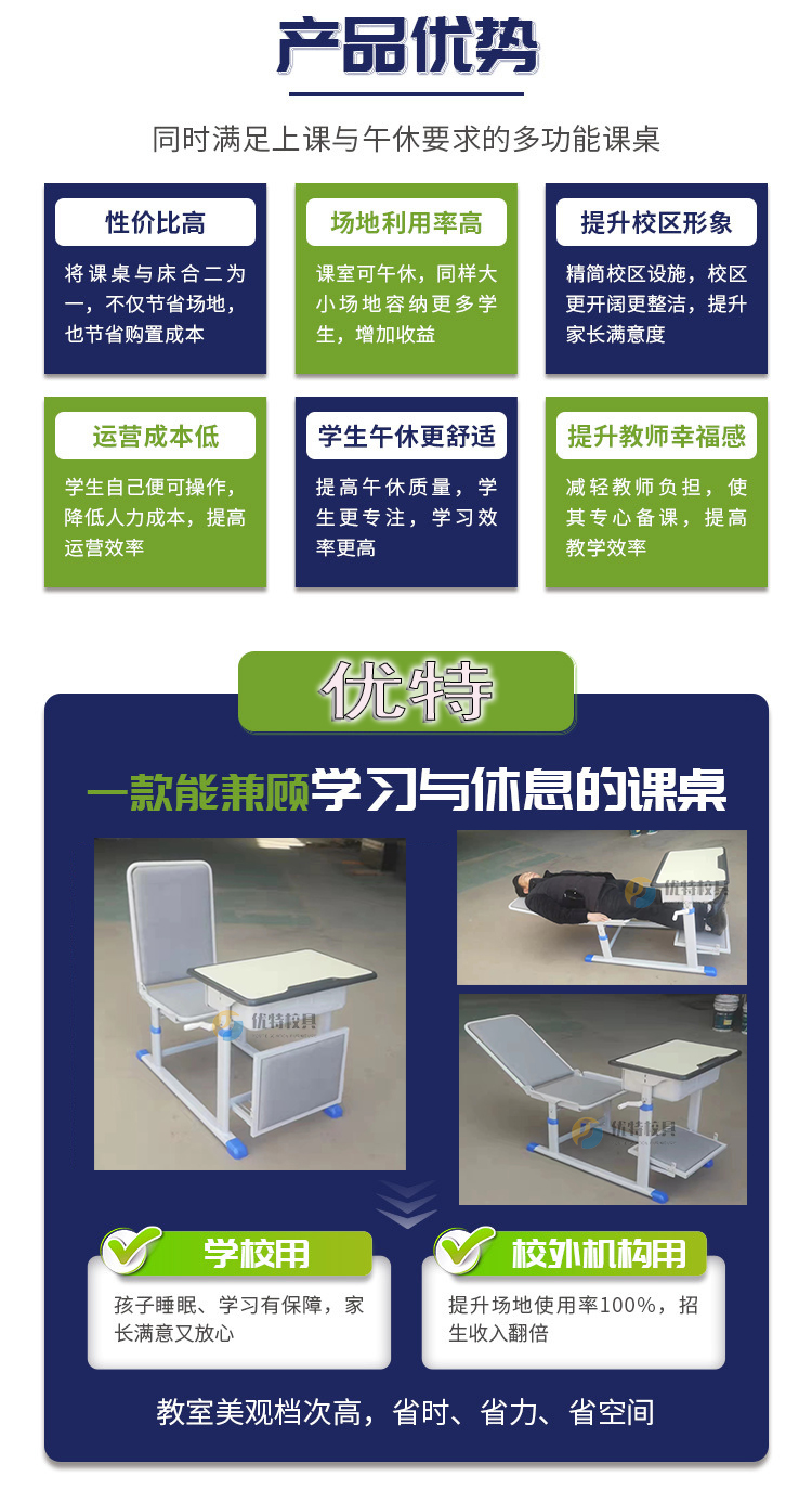 1、性價(jià)比高:將課桌和床合二為一,不僅節(jié)省場(chǎng)地,也節(jié)省購置成本。