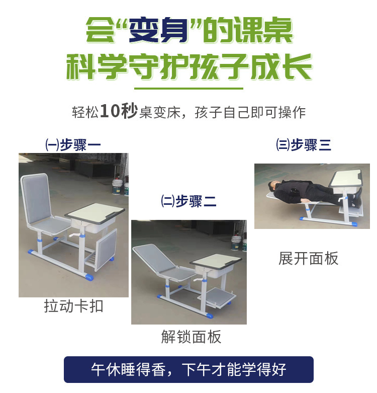 折疊午休課桌椅滿足日常學(xué)生學(xué)習(xí)書寫的使用功能,同時(shí)可以作為學(xué)生午休時(shí)的寢具使用,既符合人體工程學(xué)設(shè)計(jì)端正孩子坐姿,同時(shí)也滿足孩子午休需要,午休課桌椅的使用既節(jié)省了空間同時(shí)又為學(xué)生提供便利,可以滿足6-12歲學(xué)生的日常使用需要,可滿足小學(xué)、初中學(xué)生不同身高使用需求,同時(shí)加設(shè)海綿墊使用感更舒適。床型狀態(tài)時(shí),桌面不接觸地面,床墊可隨時(shí)拆洗,確保桌面和床面干凈衛(wèi)生。同時(shí)平鋪和收納操作簡單單人獨(dú)立即可完成收合、打開步驟,讓孩子可以更好的學(xué)習(xí)和休息。